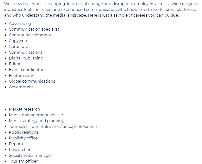 Once you reflect upon the skill sets required to be successful within a Communications and Media career, you begin to recognize the potential benefits of online learning in comparison with on-campus teaching. Below is the list of careers noted on the UOW website under Communications and Media for those unfamiliar with the discipline.
