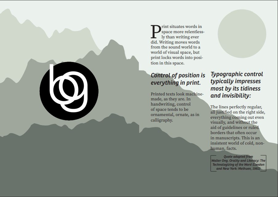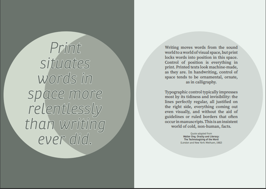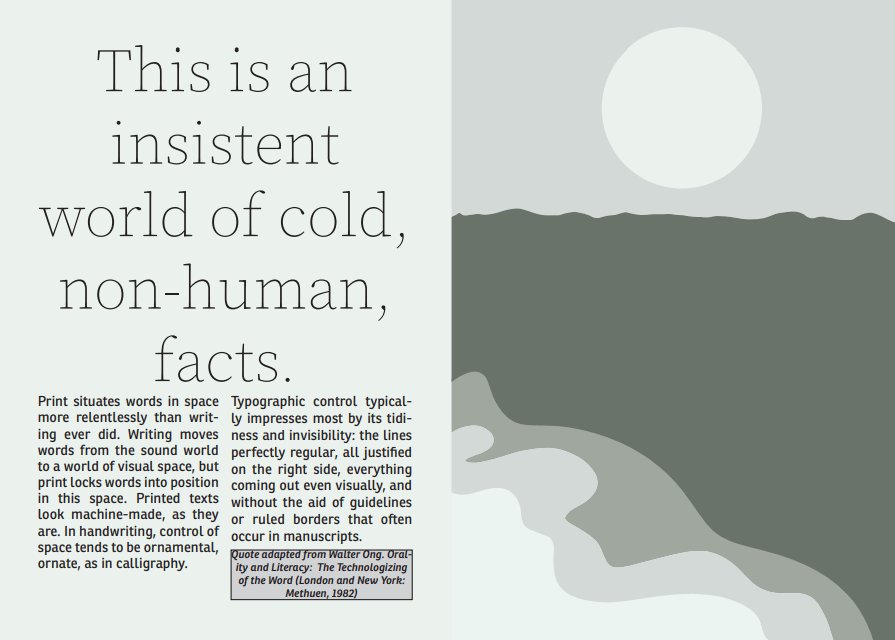 The most challenging part of this assignment was trying to create a theme out of seemingly nothing; While I did enjoy the Ransom note I made for the front cover, I felt the vibe was extremely similar to the first task we did and preferred to do something a little different for the inners of my booklet to present a better array of my capabilities. Perhaps in retrospect it would have been better to have planned the inner flow before constructing my Ransom quote but I just couldn’t go past a David Carson quote after spending so much time earlier in the semester researching the ways in which he creates. While the cover does not match the inner monologue, I feel that I attempted to channel some of the things I learnt from Carson’s practice to construct the woven tale for my elements. I believe this is most notable on pages 3-4 where the text somewhat takes the shape of the mountains in the background, while not as eclectic as Carson, I took extra caution making sure that the type had some form of expression.