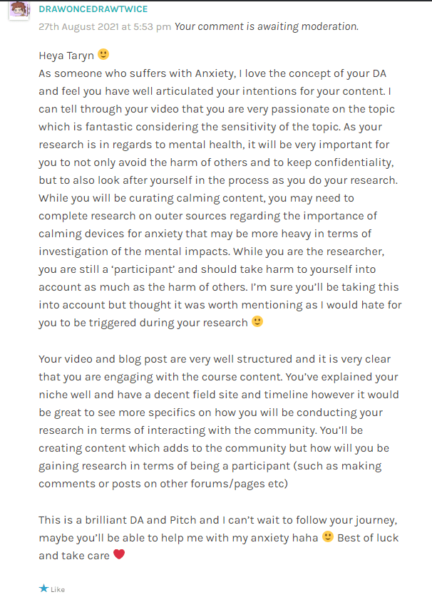 The pitches in which I reviewed were from Oryem, who is dedicated to the study of UX Design and will be referencing Sims 4 as his case study for his DA, Jacob, who will be continuing his Music Reaction Channel while providing more in-depth interactivity with the Eminem fandom, and Taryn, who is researching the importance of calming content and methods in reference to anxiety. All of these DA’s and Pitches were extremely passionate which was incredibly admirable and honestly provided me with more motivation for my own DA. But I digress.