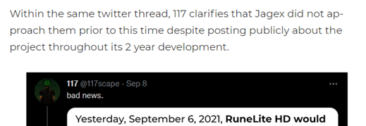 If the community can impact what elements of the game get changed or updated, why are they still unsatisfied? Despite Old School Runescape being the more popular iteration of the Runescape franchise, I’ve found through my involvement that a huge portion are unsatisfied with the implementations and decisions being made by Jagex. Within my first blog post posted this week, I did research into Jagex halting the release of a highly anticipated HD graphic mod that had been in the works for over 2 years by RuneLite, a third-party client for OSRS.