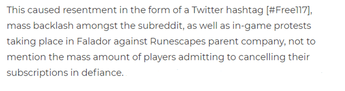 This leads to my second epiphany when conducting my research, which encompasses the power Jagex has provided the community to impact the game. With Old School Runescape being a game dedicated to the 2007 edition, it is still continuously updated on the terms of popular vote. That is, the community are the ones to decide what expansions will be added to the main narrative of Gielinor. Participatory media culture, alternatively to consumer culture, refers to the audience of a given media niche to be active and providing contribution as affiliation, expression, collaborative problem-solving and circulation. By perceiving the true potentials of the state of media production and distribution within the digital age offers a whole new decentralisation to knowledge on given topics. This is emulated within the OSRS community through their attempt to preserve as much of the collective memory to today’s standards but the issue with this has presented itself within my final epiphany, the community is still unhappy.