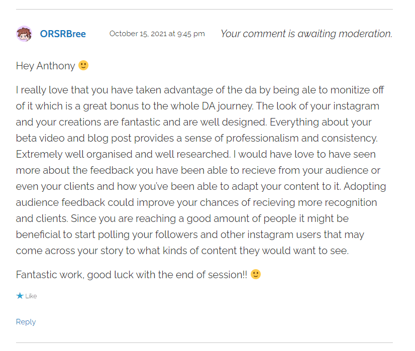 The beta video and blog post I reviewed for this week’s blog post came from Anthony in regards to his new graphic design business and Instagram, Moodie Creative. I work as a graphic designer part-time, so this was a very interesting beta to look at and made me realise that I need to step up when it comes to thew organisation and presentation of my own DA.